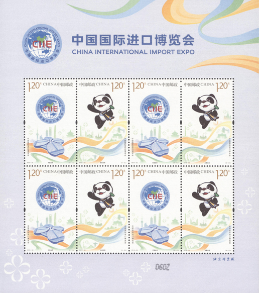 “開放合作”主體為“進博會”標識,由中間的地球、外側的淺藍色圓環、“進博會”中英文名稱和英文縮寫(CIIE)等組成;下方為“進博會”主場館國家會展中心(上海),一旁點綴的四葉草造型寓意幸運;背景采用了剪影的形式表現了京滬兩地的城市風光。“共享未來”主體是“進博會”吉祥物大熊貓“進寶”(諧音“進博”),既取“進口博覽會之寶”之意,也暗含“招財進寶”的吉祥寓意。兩枚郵票由象征“一帶一路”的金黃色和藍綠色彩帶連接,寓意財富與希望;彩帶之上用剪影形式展現了本次“進博會”12個主賓國的主要城市風光。