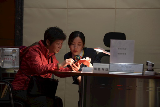 新時代的年輕員工從上一代東四郵政人手中接過接力棒,繼續探索親情服務的新內涵。圖為理財經理張婷婷指導用戶使用手機銀行辦理業務。