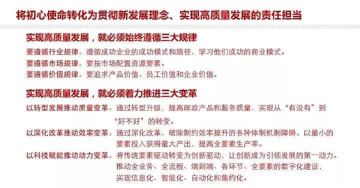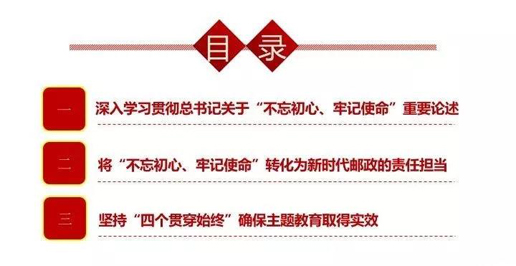 習(xí)近平總書記在“不忘初心、牢記使命”主題教育工作會議上深刻闡述了開展主題教育的重大意義、根本任務(wù)、目標(biāo)要求和重點措施。廣大郵政黨員干部要進(jìn)一步用習(xí)近平新時代中國特色社會主義思想武裝頭腦,指導(dǎo)實踐,緊扣郵政初心使命,緊密結(jié)合工作實際,將初心使命轉(zhuǎn)化為強烈的政治自覺、思想自覺和行動自覺,堅持質(zhì)量第一、效益優(yōu)先,推動企業(yè)高質(zhì)量發(fā)展,把中國郵政打造成為行業(yè)“國家隊”。