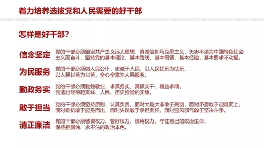 在新時代,好干部要做到信念堅定、為民服務(wù)、勤政務(wù)實、敢于擔(dān)當(dāng)、清正廉潔。理想信念堅定,是好干部第一位的標(biāo)準(zhǔn),是不是好干部首先看這一條;堅持原則、敢于擔(dān)當(dāng)是黨的干部必須具備的基本素質(zhì)。