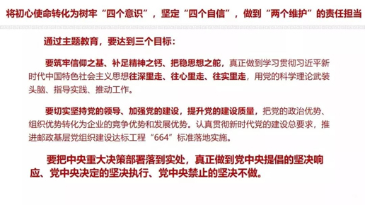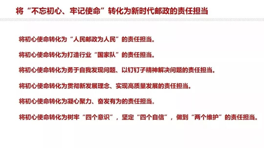 不忘初心再出發(fā),牢記使命勇?lián)?dāng)。在舉國上下喜迎新中國成立70周年之際,集團(tuán)公司黨組按照中央部署,以上率下,團(tuán)結(jié)帶領(lǐng)各級黨組織和廣大黨員干部,樹牢“四個意識”、堅定“四個自信”、做到“兩個維護(hù)”,切實增強政治自覺、思想自覺、行動自覺,有力有序有效推進(jìn)主題教育深入開展,將初心使命轉(zhuǎn)化為新時代郵政的責(zé)任擔(dān)當(dāng),做到學(xué)思用貫通、知信行統(tǒng)一,確保主題教育取得扎扎實實的成效,以主題教育的成效推動郵政改革發(fā)展、創(chuàng)新轉(zhuǎn)型取得新突破、邁上新臺階。