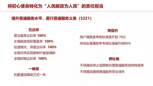 普遍服務(wù)是黨和國家賦予郵政企業(yè)的神圣使命,是法律性制度安排,是中國郵政的政治責(zé)任和政治擔(dān)當(dāng)。做好普遍服務(wù):是厚植黨的執(zhí)政基礎(chǔ)的需要,是貫徹以人民為中心的思想的需要,是體現(xiàn)企業(yè)自身責(zé)任的需要,是獲得國家支持、社會認(rèn)可的需要,是獲得人民信賴、建立發(fā)展優(yōu)勢的需要,是協(xié)同發(fā)展、做優(yōu)做強做大中國郵政的需要。