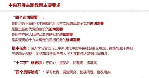 開展這次主題教育,就是要堅持思想建黨、理論強黨,堅持學(xué)思用貫通、知信行統(tǒng)一,推動廣大黨員干部不斷增強“四個意識”、堅定“四個自信”,堅決做到“兩個維護(hù)”,最關(guān)鍵的是堅決維護(hù)習(xí)近平總書記黨中央的核心、全黨的核心地位,做到“三個體現(xiàn)在”:體現(xiàn)在與黨中央保持高度一致上,體現(xiàn)在嚴(yán)守黨的政治紀(jì)律和政治規(guī)矩上,體現(xiàn)在堅決貫徹落實黨中央重大決策部署上。