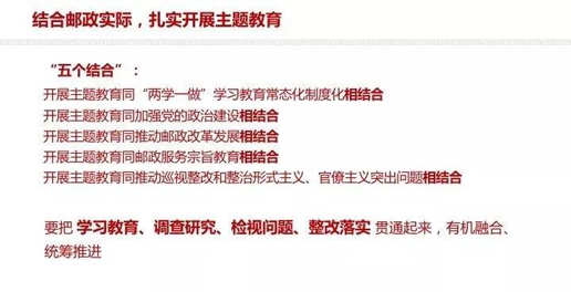 劉愛力提出,開展主題教育要做到“五個結(jié)合”:開展主題教育同“兩學(xué)一做”學(xué)習(xí)教育常態(tài)化制度化相結(jié)合,同加強黨的政治建設(shè)相結(jié)合,同推動郵政改革發(fā)展相結(jié)合,同郵政服務(wù)宗旨教育相結(jié)合,同推動巡視整改和整治形式主義、官僚主義突出問題相結(jié)合。他深入闡述了如何將學(xué)習(xí)教育、調(diào)查研究、檢視問題、整改落實貫通起來,有機融合,統(tǒng)籌推進(jìn)。