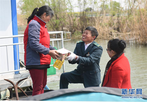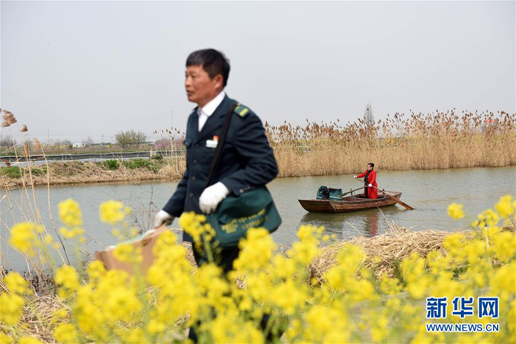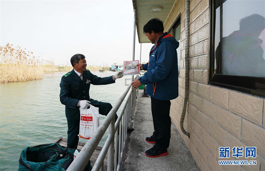 3月30日,唐真亞帶著郵包來到碼頭,準備出發送郵件。 新華社記者 季春鵬 攝