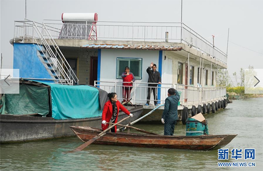 3月30日,唐真亞將小船劃離岸邊,準備前往送郵件。新華社記者 季春鵬 攝