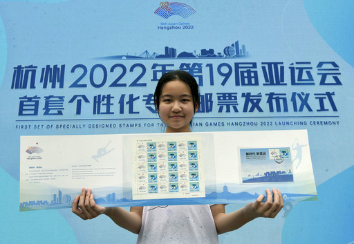 小郵迷展示杭州亞運會個性化郵票。王建民 攝