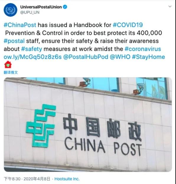 在全球疫情暴發(fā)的危機(jī)時(shí)刻,中國(guó)選擇毫無(wú)保留地將抗疫經(jīng)驗(yàn)分享給世界。萬(wàn)國(guó)郵聯(lián)在其官方社交媒體上表示:“中國(guó)郵政發(fā)布的這一份針對(duì)新冠肺炎疫情的防控手冊(cè),旨在為40萬(wàn)名郵政員工提供最好的安全保護(hù),提高他們?cè)谝咔橹凶鳂I(yè)的安全防范意識(shí)。”