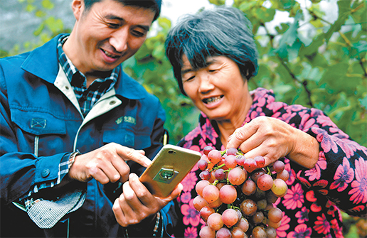 張海洋與趙本增一道發(fā)起現(xiàn)場直播后,到自家葡萄園采摘的游人比以往多多啦。圖為地頭直播現(xiàn)場。