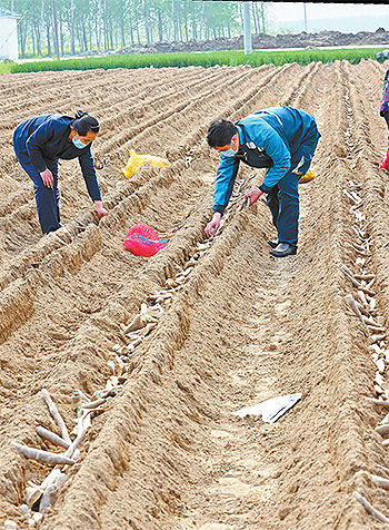 看到誰家忙不過來,趙本增只要有空就會主動上前搭把手。圖為春耕時節(jié),趙本增與支局的幾位同事幫助村民王大柱種植山藥。