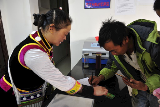 在外出投遞時,桑南才的妻子蜜曉琴就成為他得力的工作助手,當(dāng)起了稱桿郵政所的臨時“營業(yè)員”。“這里必須有人,如果客戶來到這里卻沒人,讓他們在這里等著也不好,所以我就過來幫他們辦理一些業(yè)務(wù)。”