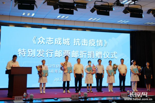 7月8日上午,河北省衛生健康委員會、中國郵政集團有限公司河北省分公司、河北省郵政管理局聯合舉辦《眾志成城 抗擊疫情》特別發行郵票紀念郵折捐贈儀式,向支援湖北的河北醫務人員以及參與新冠肺炎疫情防控工作的先進單位和個人捐贈郵折2300個、個人抗疫紀念張606個。
