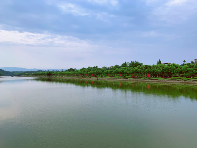 一帶澄澈碧綠的河水緩緩流淌,岸邊樹木蔥蘢、綠草如茵。有畫者在依河寫生,有行者在閑適漫步,不遠處嘹亮悠長的嗩吶聲隨風飄揚。