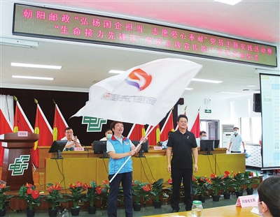 郵政志愿者代表高楠在啟動儀式現場向廣大郵政職工發出志愿倡議,并接過“生命接力先鋒隊”隊旗?!趵钗?攝