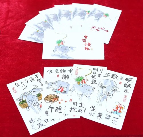 《牛年快樂》普通明信片的郵資圖選取了第二輪生肖牛郵票剪紙?jiān)髡啐R秀花的作品,由王虎鳴設(shè)計(jì),畫面中的牛昂首向上、充滿力量。兩套明信片分別采用水彩繪畫及水墨手繪形式,畫面溫暖充滿童趣,展現(xiàn)出濃厚的春節(jié)民俗特色,分別由景紹宗及段雅婕、潘振磊設(shè)計(jì)。《辛丑吉祥》極限明信片由韓美林先生設(shè)計(jì)指導(dǎo),明信片正面左下角圖案及背面圖案與郵資圖相同,形成極限概念,四枚明信片廣告面可組成完整的“恭賀新春”吉祥短語。祝福卡《牛年如意》《新春送福》,畫面以健碩而充滿活力的牛為主要形象,傳遞國裕民康的良好祝愿,分別由張旺、武世寧設(shè)計(jì)。2021年賀年專用郵票分別為《國裕家康》《新春送福》,兩套郵票構(gòu)成的小全張,以紅色、金色為主體色調(diào),將“福”字、甲骨文的“門”字及中國書畫中的斗方元素進(jìn)行組合設(shè)計(jì),寓意歲月更新福滿門、開門見福迎新春。《國裕家康》由韓美林設(shè)計(jì),《新春送福》由陳楠設(shè)計(jì)。相關(guān)產(chǎn)品自11月5日起在全國郵政網(wǎng)點(diǎn)銷售,廣大用戶可在郵政網(wǎng)點(diǎn)和中國郵政微商城明信片專區(qū)選購。