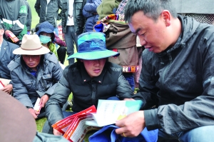 扎西鬧吾(右一)為牧戶宣講金融政策