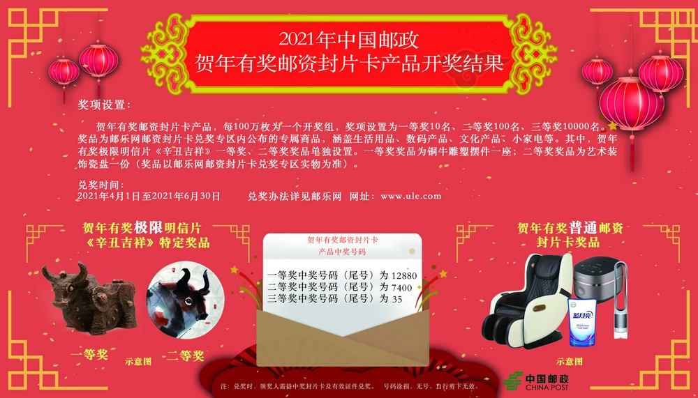 2021年賀年有獎郵資封片卡中獎號碼于3月26日產生。現將具體中獎信息通知如下: