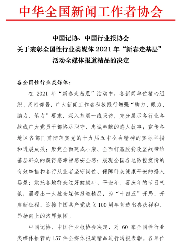 4月23日,中國記協(xié)、中國行業(yè)報協(xié)會發(fā)布關(guān)于表彰全國性行業(yè)類媒體2021年“新春走基層” 活動全媒體報道精品的決定,對60家全國性行業(yè)類媒體推薦的157件全媒體報道精品進(jìn)行通報表彰。《中國郵政報》社的3件作品榜上有名,它們是:《這位郵政小哥憑啥上春晚》(程雪梅、陳顥月、楊佳昕、王勤東、雷浩彬),《家的味道》(呂磊、臧弋萱、張明月、汪堯、楊艷),《走郵路 看中國》(集體)。