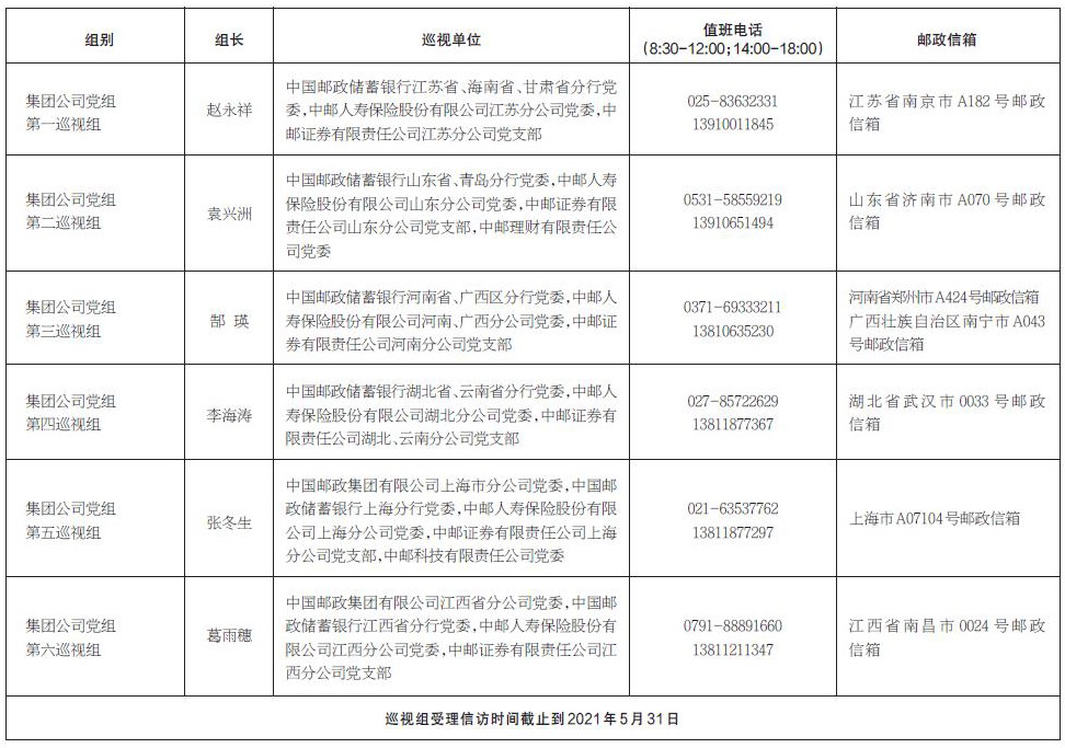 中國郵政集團有限公司黨組2021年第一批巡視進駐一覽表