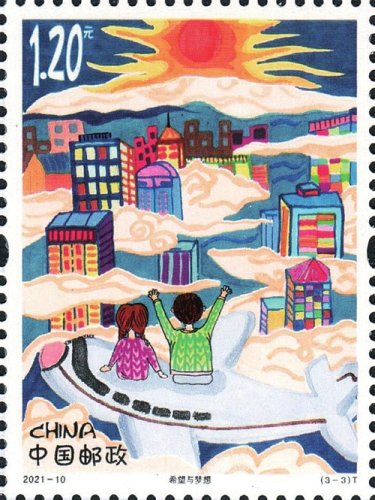 登上《兒童畫作品選》特種郵票的3幅作品“我的中國夢”“國粹之韻”和“希望與夢想”,分別由上海市同濟小學的楊曉芒、合肥新站壽春實驗中學的費玉婷、上海市周浦第三小學的錢昕逸3位小朋友設計。第一枚通過描繪我國航空航天事業、城市、交通網絡繁榮發展等場景,表達了少年兒童不斷追尋探索宇宙的夢想以及對未來美好生活的憧憬;第二枚描繪了傳統文化與城市發展、現代科技共繁榮的場景,表達了少年兒童對中華優秀文化的熱愛與傳承;第三枚描繪了偉大祖國不斷發展的場景,少年兒童登高望遠、憧憬未來。三枚郵票緊密圍繞主題,展現出少年兒童對黨領導下的偉大祖國的無比熱愛、由衷禮贊和美好祝愿。