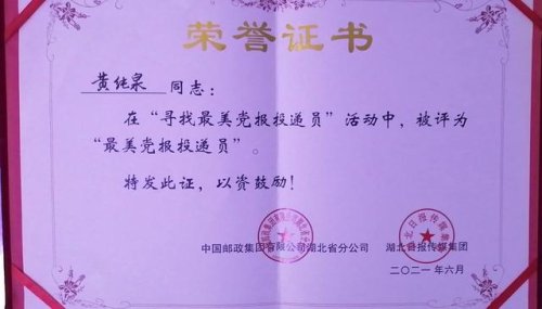 7月20日,荊州市郵政分公司相關(guān)負責人告訴記者,在中國共產(chǎn)黨百年華誕之際,黃純?nèi)@得湖北日報、湖北省郵政分公司聯(lián)合表彰的“最美黨報投遞員”稱號,屬荊州市唯一。記者立即聯(lián)系到了黃純?nèi)?/p>