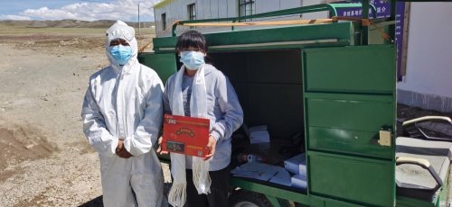 巴桑彭措(左)將錄取通知書送到牧區孩子手中。(受訪者供圖)