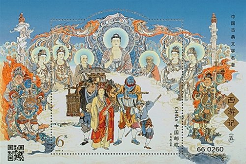 該套郵票是中國(guó)郵政自2015年發(fā)行的《中國(guó)古典文學(xué)名著——〈西游記〉》系列郵票的第五組,描繪了小說(shuō)第七十四回至第一百回的五段故事場(chǎng)景。4枚郵票分別表現(xiàn)的是,孫悟空在獅駝嶺大戰(zhàn)青毛獅子、黃牙老象、大鵬雕三怪時(shí)激烈的打斗場(chǎng)景;孫悟空、豬八戒為救助被當(dāng)作藥引的比丘國(guó)眾孩童,在南極仙翁幫助下收服白鹿精、擒殺白面狐貍的場(chǎng)景;哪吒隨孫悟空去陷空山無(wú)底洞,擒獲欲強(qiáng)迫唐僧成親的金鼻白毛老鼠精的場(chǎng)景;孫悟空領(lǐng)著月宮主人太陰星君來(lái)到天竺國(guó),收服假冒公主的廣寒宮搗藥玉兔的場(chǎng)景。小型張表現(xiàn)了師徒四人和白龍馬取回真經(jīng)后,真身返回靈山,終成正果的場(chǎng)景。畫(huà)家運(yùn)用傳統(tǒng)工筆重彩的手法,同時(shí)注重以形寫(xiě)神,人物刻畫(huà)逼真?zhèn)魃?,在方寸間生動(dòng)地演繹出大家熟知的故事情節(jié)。