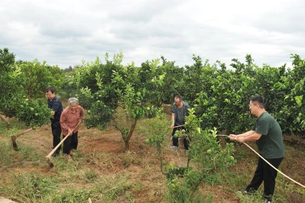 采訪組在郵政惠農(nóng)合作示范園為橙子樹松土、澆水