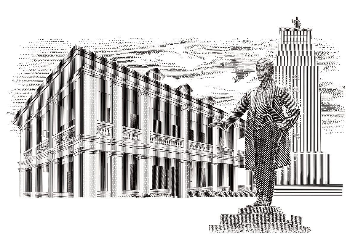 郵票二圖由徐喆和劉明慧兩位雕刻師共同創(chuàng)作。徐喆負責建筑部分,劉明慧負責雕像部分,于是同一枚郵票呈現(xiàn)出了兩種雕刻風格,建筑的粗獷和人物的細膩,二者和諧統(tǒng)一、相得益彰。劉明慧對人物的刻畫非常準確,能夠表現(xiàn)出原作的各種細微之處,特別是對人物面部表情的精準把握,呈現(xiàn)出雕像特有的質(zhì)感和光影效果。選用紅色雕刻油墨印制,表達愛國精神,橘色的熒光使畫面更加溫暖、莊重。淡淡的米黃底色為郵票營造出一種復古的氛圍,既體現(xiàn)了年代感又與主題相得益彰,展現(xiàn)出黃埔軍校百年歷史的滄桑與厚重。