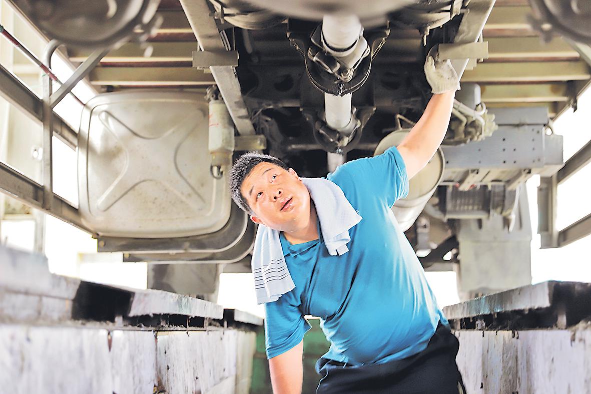 張旻歸班后檢修車輛。□周清 攝