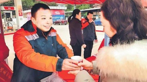 梧州市分公司開展?fàn)I銷活動,朱哲給客戶遞上熱水。