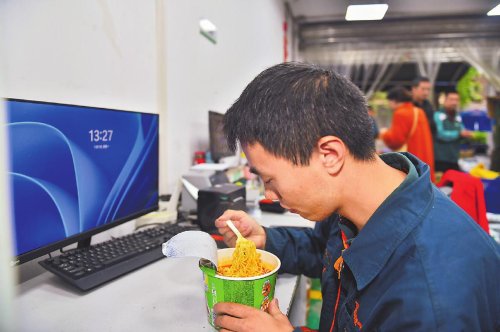 13:30左右,劉孜力上午的工作才結(jié)束。返回攬投部后,他急匆匆吃了一碗泡面,便又立即開始下午的投遞。一碗泡面對于劉孜力來說,是這個“雙11”期間最常吃的便飯。有些時候,一份炒飯、一碗面條,或者自帶便當(dāng),就成了攬投員們這一天補充體力的來源。顧不上休息,沒時間吃飯,肚子餓了隨便塞上一口,也是他們這期間的常態(tài)。