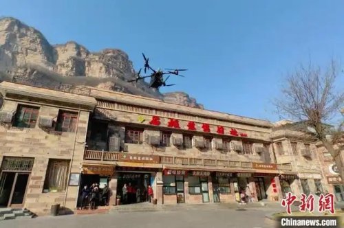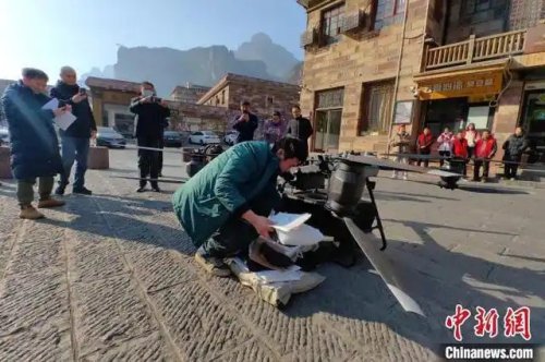 圖為無人機“郵遞員”降落在林州石板巖鎮中心廣場?!埧≤?攝