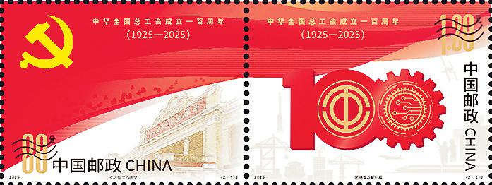 1925年5月1日,中華全國總工會在廣州正式成立。百年來,在黨的領(lǐng)導(dǎo)下,中華全國總工會櫛風(fēng)沐雨,始終與黨同心、跟黨奮斗,前赴后繼、奮勇拼搏,艱苦奮斗、建功立業(yè),譜寫了壯麗的篇章。《中華全國總工會成立一百周年》紀(jì)念郵票圖案采用連票設(shè)計形式,以紅色為主色調(diào)。第一枚“億萬職工心向黨”,以黨徽、中華全國總工會廣州舊址為畫面主體,以意象化的紅旗為背景,并點(diǎn)綴心形圖案,象征中華全國總工會初心向黨,在黨的領(lǐng)導(dǎo)下走過百年光輝歷程。第二枚“團(tuán)結(jié)奮斗新征程”,將中華全國總工會會徽、齒輪、芯片等與數(shù)字“100”組合設(shè)計,以意象化的紅旗為背景,并輔以城市建筑、港口、高鐵、飛機(jī)、火箭、空間站及勞動者等元素,象征著進(jìn)入新時代以來,中華全國總工會在黨的領(lǐng)導(dǎo)下不斷奮進(jìn),為實(shí)現(xiàn)中華民族偉大復(fù)興作出更大貢獻(xiàn)。