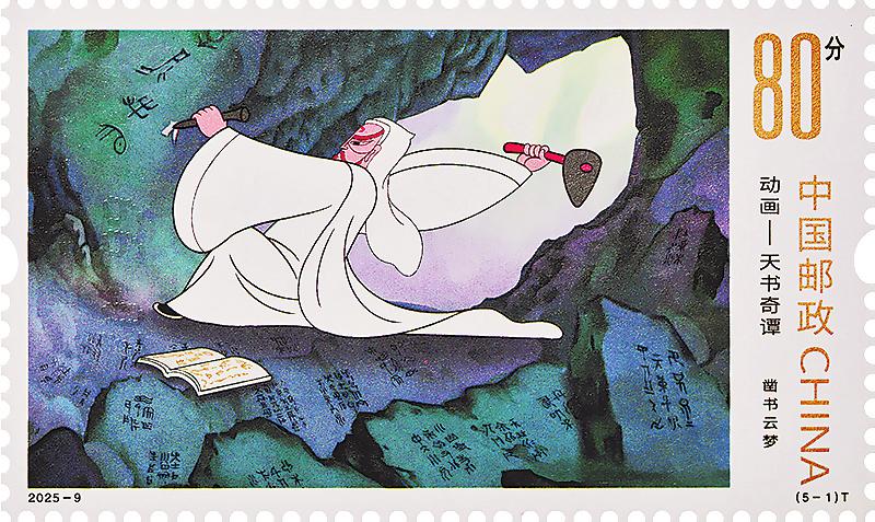 本套郵票以國產原創動畫片《天書奇譚》主要人物蛋生為主線,通過5組場景展現故事精髓,并結合動畫特點,巧妙設計熒光效果,整體畫面清晰,色彩飽和。第一枚“鑿書云夢”表現了袁公為造福人類偷偷下凡,把天庭的珍奇書籍“天書”上的內容鑿刻在云夢山石壁上的場景。袁公揮袖甩臂,形象生動,通過山體傾斜角度與人物線條展現磅礴氣勢。熒光工藝凸顯巖壁篆刻的天書銘文,為畫面增添一絲神秘色彩。第二枚“蛋生拜師”聚焦袁公授藝、蛋生修習法術的場景,蛋生凌空而起的飛行姿態構成視覺焦點,周身圍繞的飛鳥在紫外燈下顯現,使畫面更加鮮活。第三枚“巧用寶盆”表現了蛋生使用聚寶盆變出7個一模一樣的老太爺來戲耍縣令。畫面重構了縣令府衙場景,熒光效果猶如具有透視能力,穿透聚寶盆的遮擋,展示出聚寶盆內的老太爺形象,盡顯荒誕幽默之感。第四枚“大戰狐妖”表現了蛋生與狐妖大戰、斗智斗勇的情節,蛋生與三只狐貍大戰是動畫的一個高潮部分。熒光部分的“水幕”“火焰”效果,再現激烈的打斗場景,形成較為強烈的視覺效果。第五枚“天書永傳”表現了動畫結局,蛋生遵從袁公的教誨將天書內容牢記于心,帶到凡間,為民除害,造福百姓。前景為蛋生牢記天書實景呈現,背景則運用白熒光和紅熒光勾勒袁公形象,隱喻“傳承—守護—發揚”的思想。
