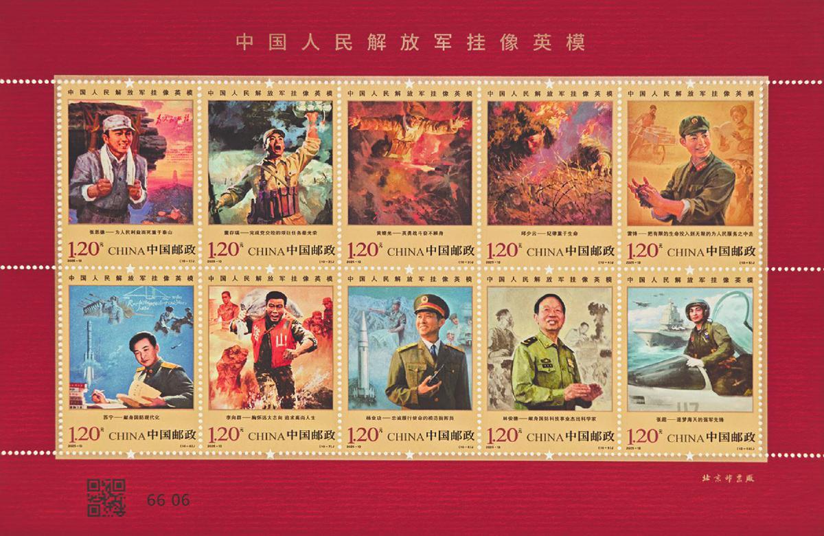 8月1日,《中國人民解放軍掛像英?!芳o念郵票發(fā)行。該套郵票一套10枚,展現(xiàn)的英模人物分別是:張思德——為人民利益而死重于泰山,董存瑞——完成黨交給的艱巨任務最光榮,黃繼光——英勇戰(zhàn)斗奮不顧身,邱少云——紀律重于生命,雷鋒——把有限的生命投入到無限的為人民服務之中去,蘇寧——獻身國防現(xiàn)代化,李向群——胸懷遠大志向追求高尚人生,楊業(yè)功——忠誠履行使命的模范指揮員,林俊德——獻身國防科技事業(yè)杰出科學家,張超——逐夢海天的強軍先鋒。